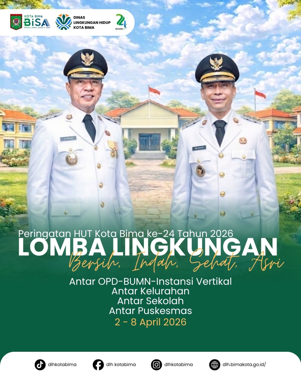 Dalam rangka meningkatkan kepedulian terhadap perlindungan dan pengelolaan lingkungan hidup serta memeriahkan HUT Kota Bima ke-24 Tahun 2026, Pemerintah Kota Bima menyelenggarakan *Lomba Lingkungan Bersih, Indah, Sehat, dan Asri (BISA)* antar Organisasi Perangkat Daerah - BUMN - Instansi vertikal, antar Puskesmas, antar Kelurahan, dan antar Sekolah.