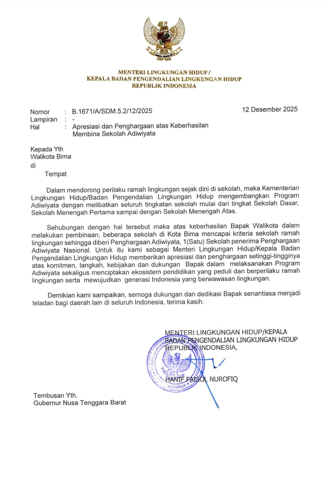SDN 11 Manggemaci Raih Adiwiyata Nasional 2025, Walikota Bima Terima Apresiasi Menteri Lingkungan Hidup